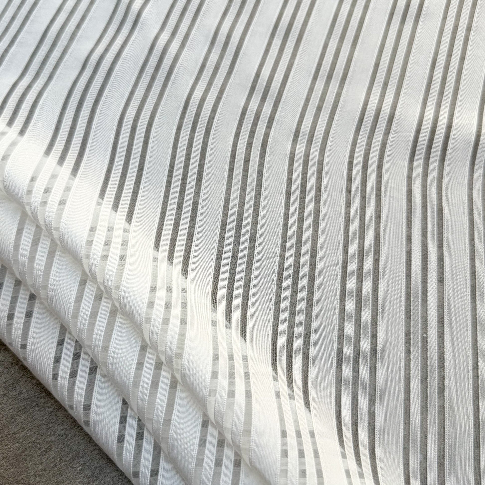 Alightweight, semi-sheer chiffon featuring a delicate woven translucent stripe, where alternating solid and translucent lines create a soft, elegant texture.